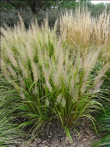 Medium size clumps of green grass with a more open form. Tall stems with fluffy bottle-brush like plumes gracefully arch from the clump; plumes open slightly pink and dry to a bronze hue. Tolerates moist locations.