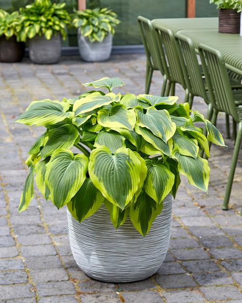 Large; thick gold leaves with dark green centers are striking in contrast. Will grow in shade or full sun. Lavender flowers in summer. A sport of Hosta Abiqua Moonbeam.
